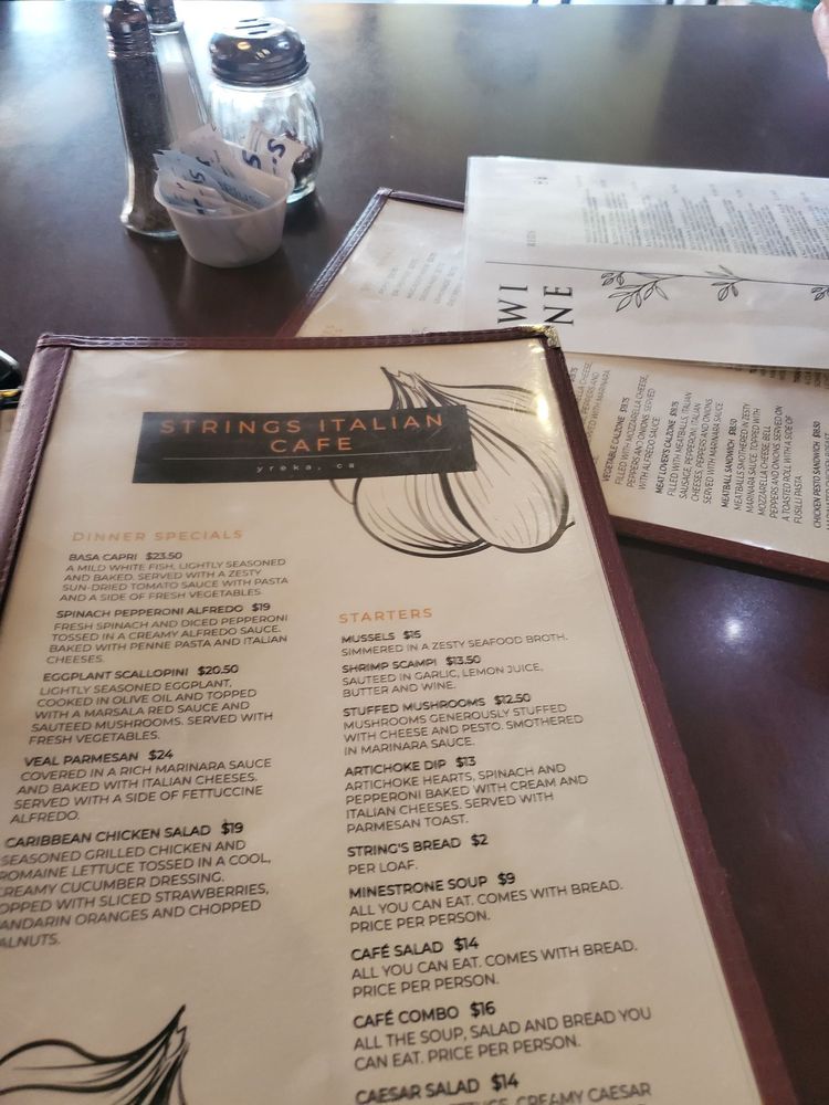 Welcome to Strings Italian Cafe, a delightful culinary haven located in Yreka, California. Nestled at 322 W Miner St, this charming eatery tantalizes your taste buds with a unique fusion of Italian and American flavors. The menu features an enticing selection of Fish & Chips, Burgers, and traditional Italian dishes, ensuring something for every palate.
